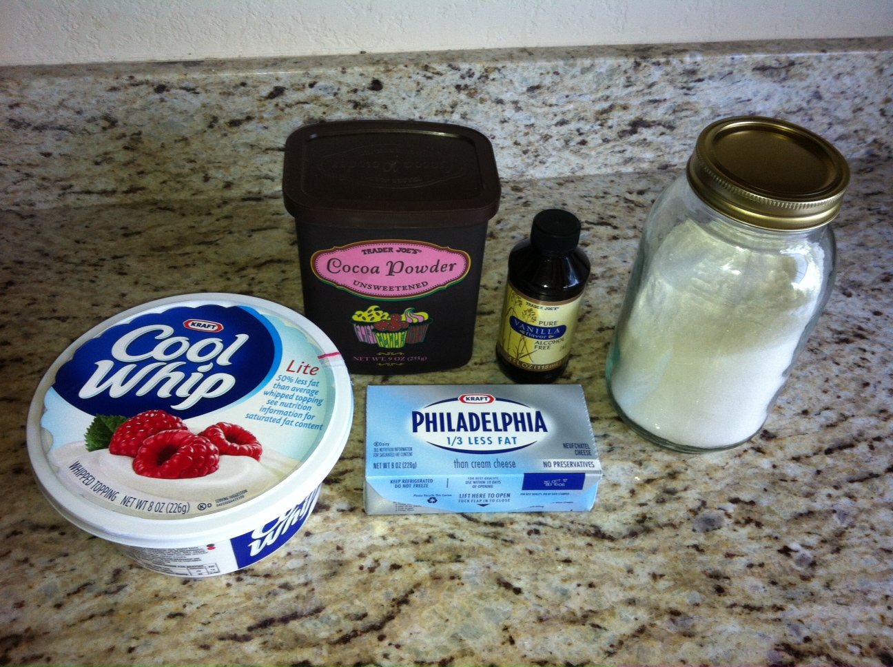 1. In a large bowl, combine the sugar and cream cheese and beat with a hand mixer until combined. Add the cocoa powder and vanilla extract and beat again until thoroughly mixed. Add the Cool Whip and continue to beat until well combined.